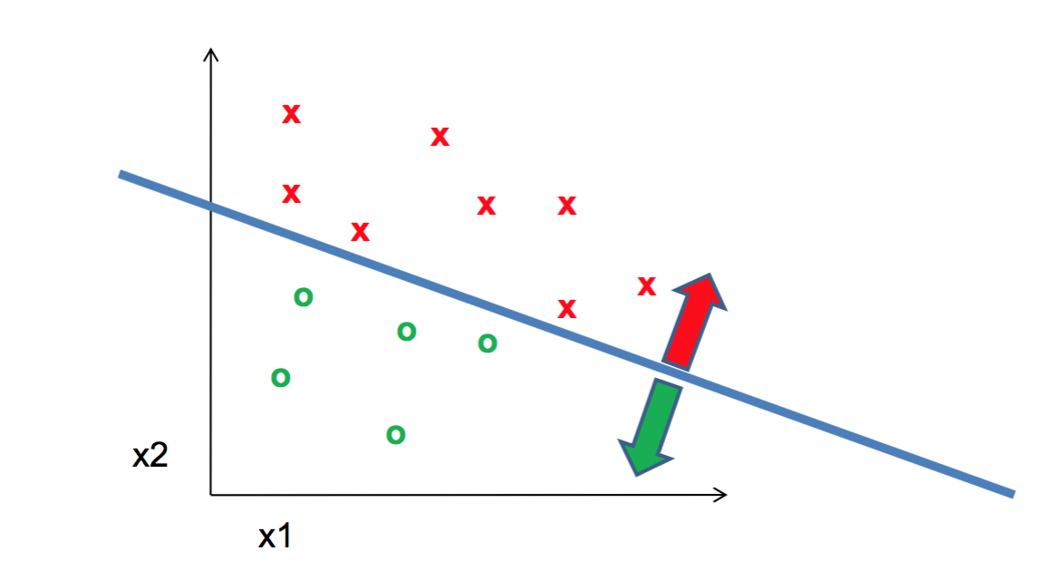 Once we have our SIFT feature for each image in train and test dataset, we classify it using linear SVM. Linear SVM generates a linear binary classifier. Since we have 15 classes, we have to perform 15 one vs all classification. With this, we get 15 binary classfiers. The linear classifiers are of the form WX + B = class. Since it is a binary classifier, the class is either +1 or -1 denoting belongs to class, and does not belong to class respectively. W is the matrix of weights, and B is the vector of weights. An example of linear classifier is shown in figure below.