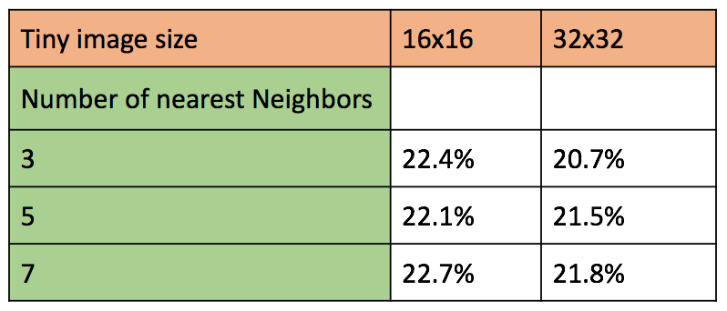 Figure 2a: Table of accuracies for different tiny image sizes and number of nearest neighbors.