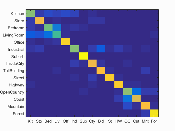 The confusion Matrix showing the results obtained by combining the fatures of the original image with the first level downsampled image. The accuracy obtained was 61.5%