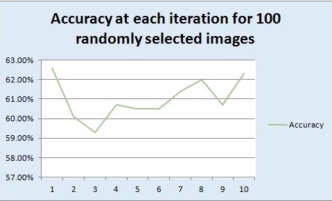 The x-axis shows the number of iterations and the y-axis shows the accuracy of categorization. The average performance reported was 61.01% and the standard deviation achieved was 0.0104. From the accuracy we can see the variation because at different time different images will be picked up. Sometimes some features of a particular category can be seen while others will be missed. So we get random accuracies everytime.