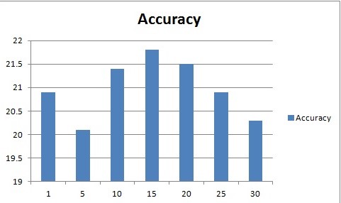 The x-axis shows the value of k and the y-axis shows the accuracy of classification with respect to the changing value of k. The maximum accuracy was obtasined by using k = 15.