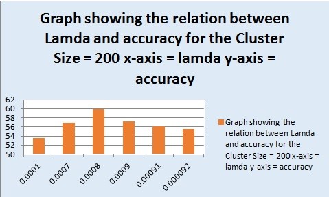 The x-axis shows the value of lamda and the y-axis shows the accuracy of classification with respect to the changing value of lamda. The maximum accuracy was obtained by using cluster size = 200 and lamda = 0.0008.