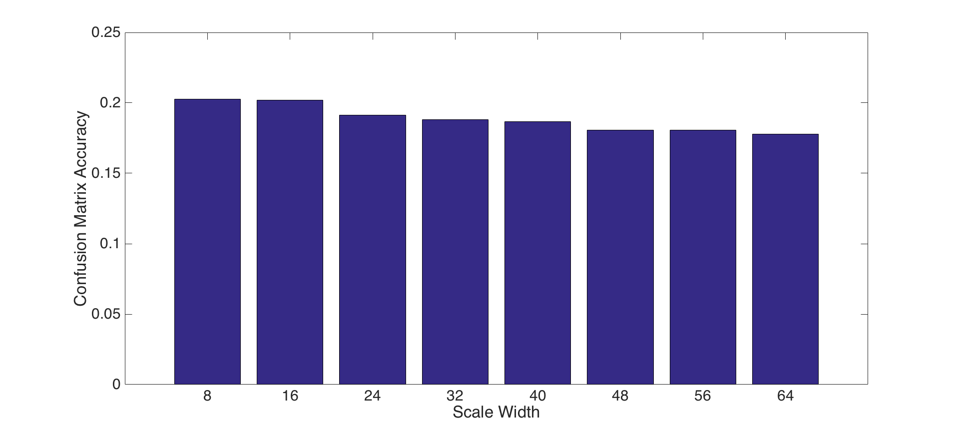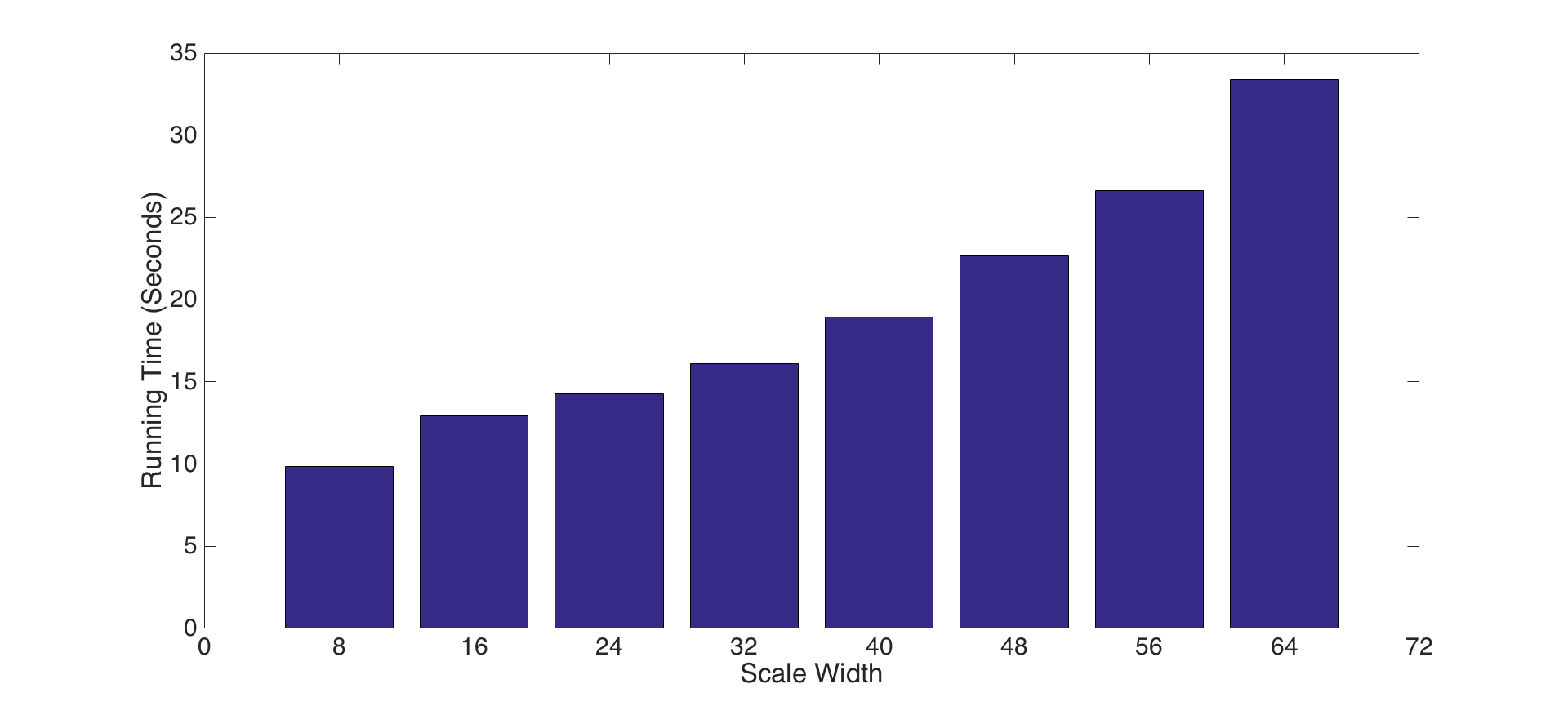 1- Experiment with features at multiple scales: For this experiment, we perform tiny image representations and nearest neighbor classifier in different scale dimension. To do this, we pick dimensions from 8 to 64 by incrementing it 8 in each iteration and take the running time and accuracies for each. Figure-4 and Figure-5 present the accuracies and running times for each dimension, respectively. The results show that increasing scale size is not a good decision in terms of both for accuracy and efficiency.