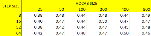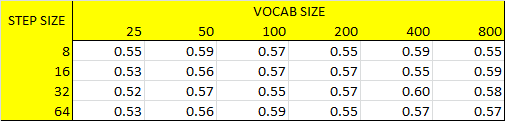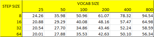 Fig.10: Runtimes for each step size by vocab size tuning on the left. Average LAMBDA values for vocab sizes for each step size on the right. |
