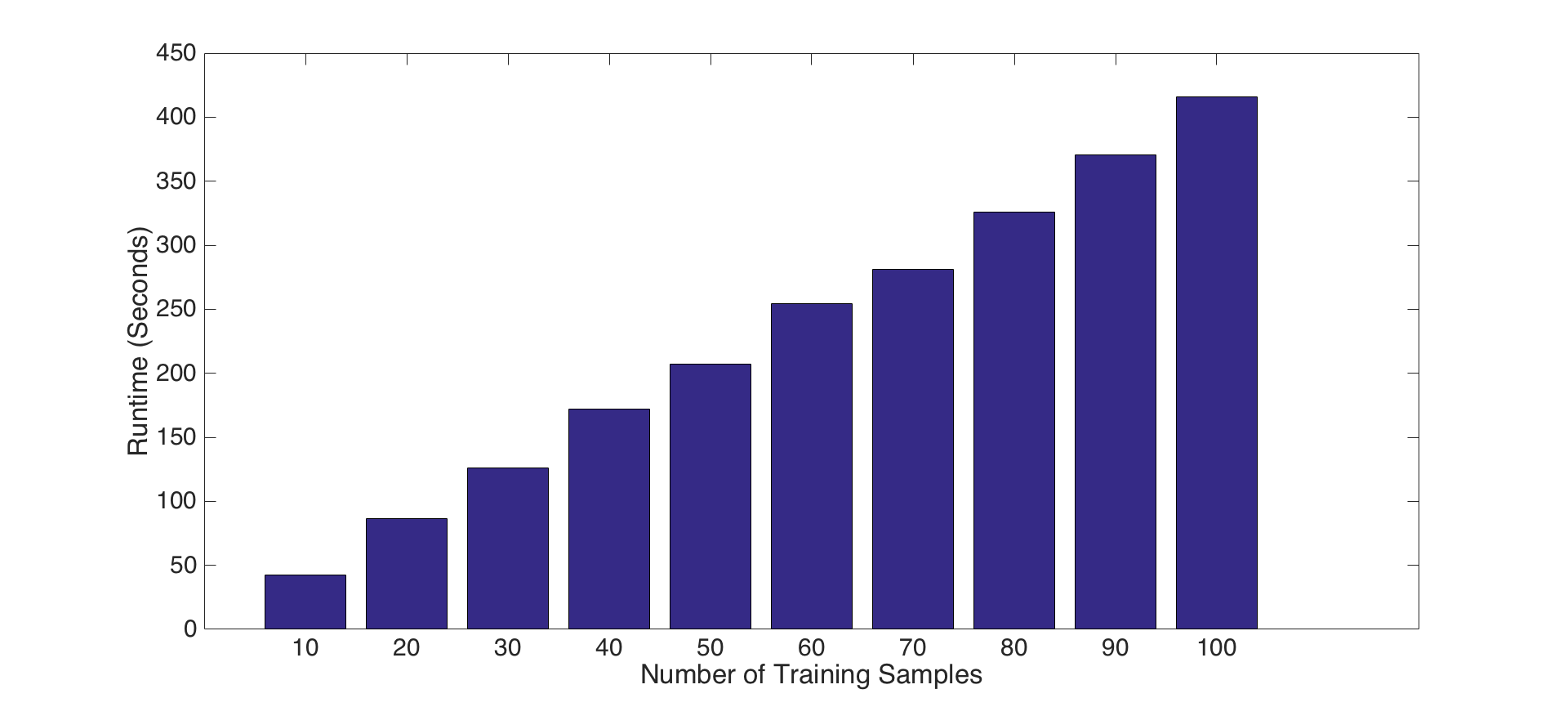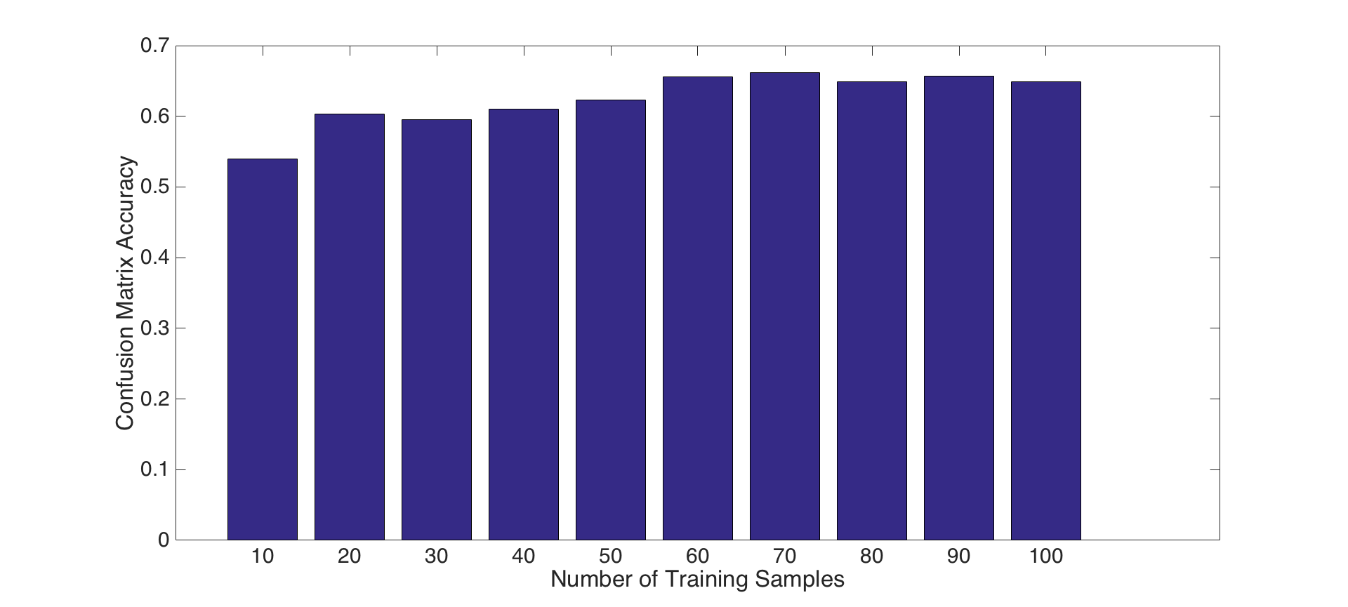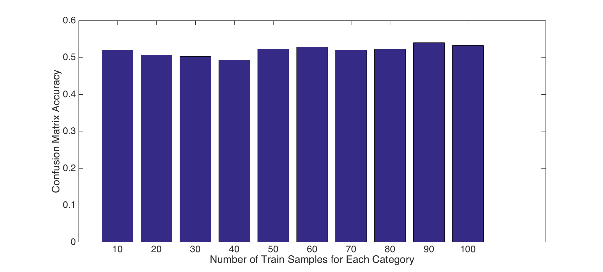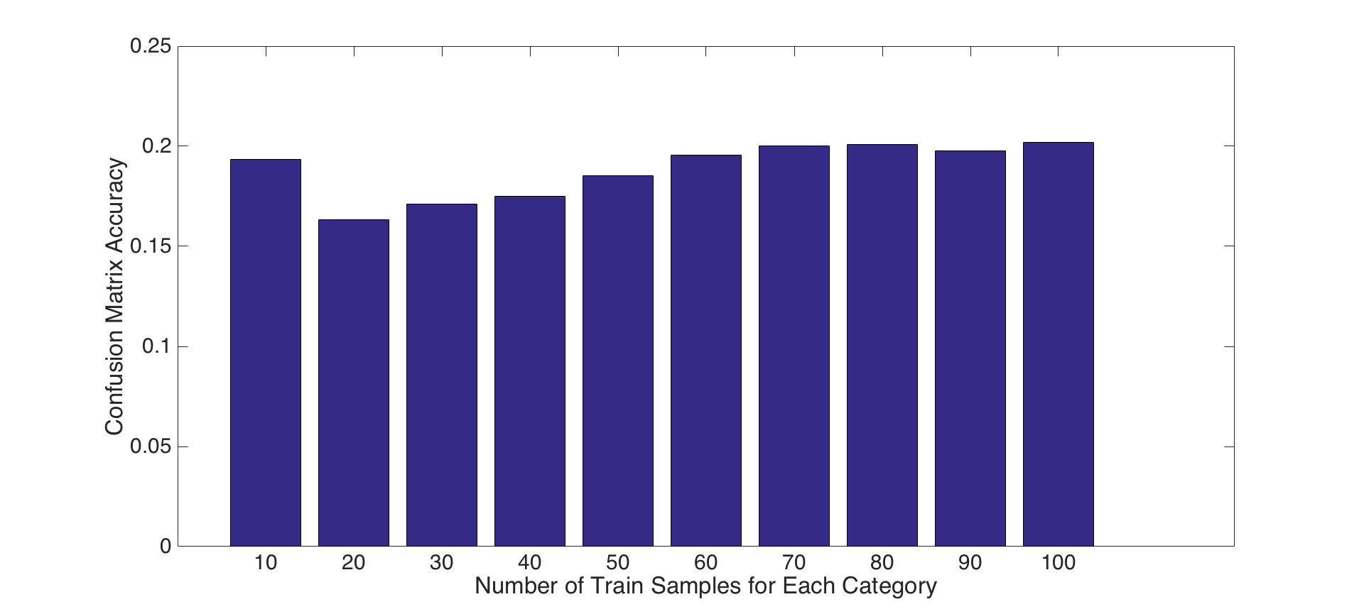 2- Tuning number of training samples parameter: For this experiment, we present the impact of the number of train samples for each parts presented above. To do this, we increment the number of train samples from 10 to 100 by 10 in each iteration, and, repeat this for each feature set and classifier combinations presented above parts. Following figures show the results for accuracy and runtime changes by number of train samples for PART-I, PART-II and PART-III features and classifiers, respectively. Results show that number of train samples how no significant effect on accuracy, but, has negative effect on running time for tiny images and bag of SIFT features with nearest neighbor classifier. That is, accuracies are not increasing as the number of training samples increase, but, running time for training is increasing significantly. Hence, choosing a small number of training samples is a good decision for efficiency. On the other hand, number of training samples has an impact on linear SVM classifier as shown in Figure-8. Although, it increases the running time, it has a reasonable contribution on performance until some points. For instance, after 60 samples the accuracy does not increase too much, but, the running time increase dramatically. Hence using 60-70 samples is a good design decision for both accuracy and efficiency.