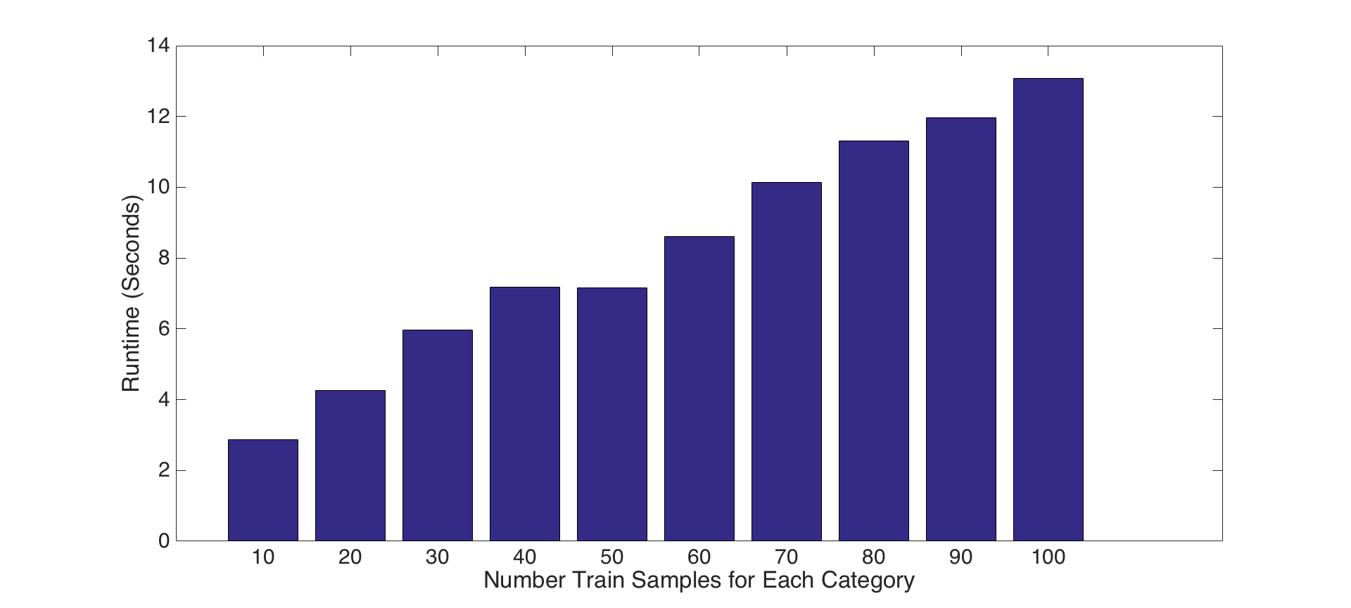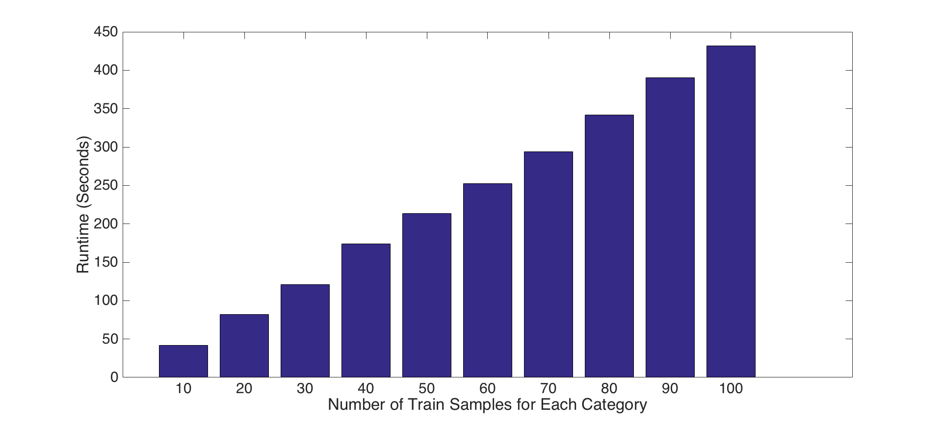 Fig.7: Accuracy and Runtime changes by number of train samples for bag of SIFT features and nearest neighbor classifier. |