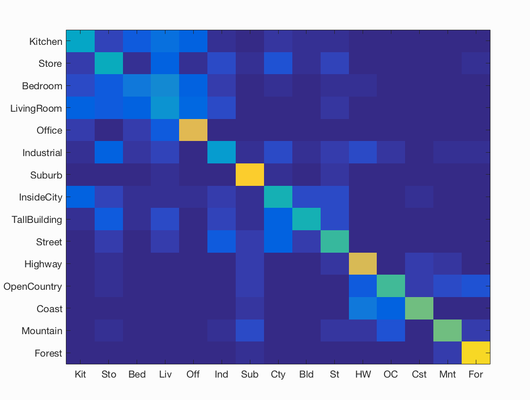 A far better approach to describing an image relied on using a bag of SIFT descriptor. For each image, SIFT features are found using vl_feat's built-in function and are categorized into the 'visual words' with a histogram approach. For my histogram, I used weights for the top ~5 neighbors for each of the features, and I noticed a modest improvement in results. This is likely because more information about the picture is retained and less overfitting occurs (as with using a larger K value in KNN). Finally, the histogram was normalized and the result was stored appropriately. The parameter that affected performance the most significantly in this stage was the step_size of the SIFT feature extraction. With too large of a step size, the implementation would run quickly, however the accuracy would suffer tremendously. This is because we are effectively reducing the sampling rate and losing information from the image that may be vital to accurate classification. Increasing the number of features extracted from each image also improved the results by 2-3%. Additionally, the 'fast' flag was turned off to improve performance, but no significant improvement was observed. All in all, this SIFT descriptor approach was able to improve my accuracy with a simple 1-NN to 0.539!