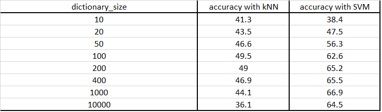 The size of SIFT feature was fixed to 10 and the step was set to 5 and the vocabulary was built with different number of cluster sizes. This dictionary was then used to compute classification task and the accuracy was noted. Results are as below: