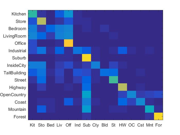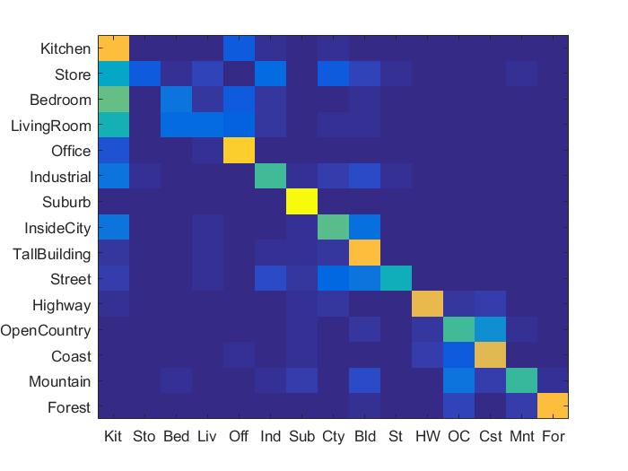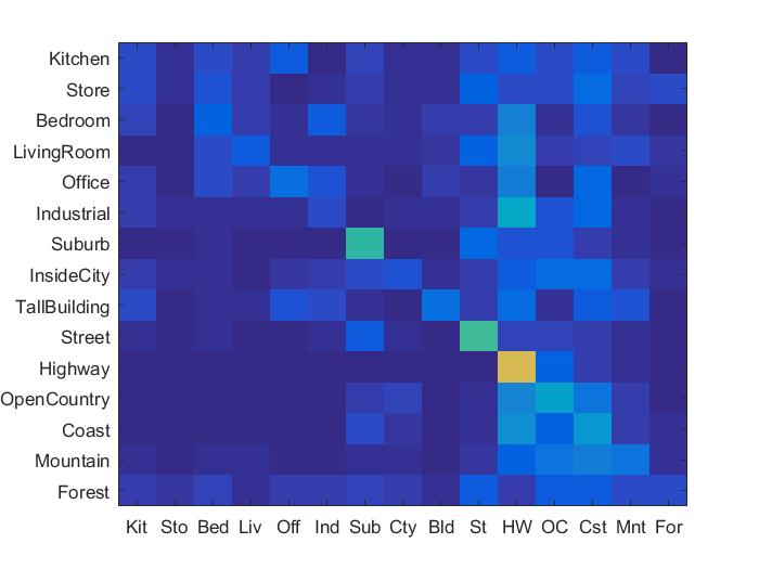 The bag of SIFT features is quantised and thus loses the spatial information. Adding spatial information to the features, improves the data representation and thus results in better accuracy. Spatial information was added to the features by implementing the spatial pyramid feature representation described in Lazebnik et al 2006. For level 0, the entire image is considered a block and bag of features for it is added to features. For level 1, the image is divided into 4 halves and the bag of features for each block as added as feature for that image. For level 2, we divide the image into 16 blocks and bag 0f features for each is added to the features of that image.
