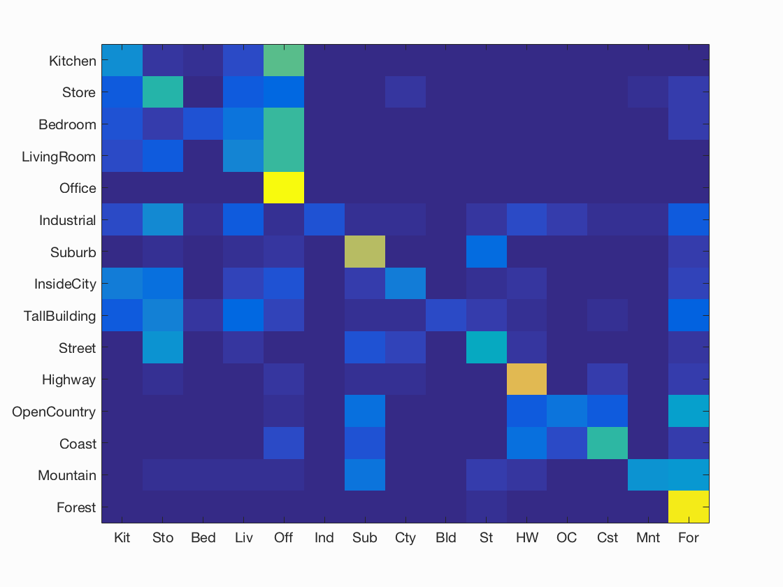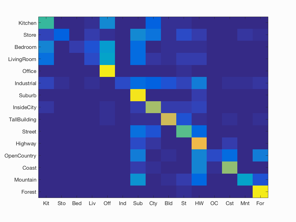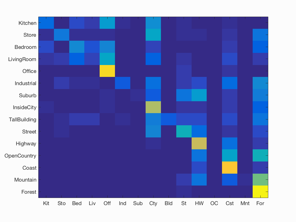 Results for bag of SIFT representation and linear SVM classifier with vocabulary size=1000, LAMBDA=0.0001