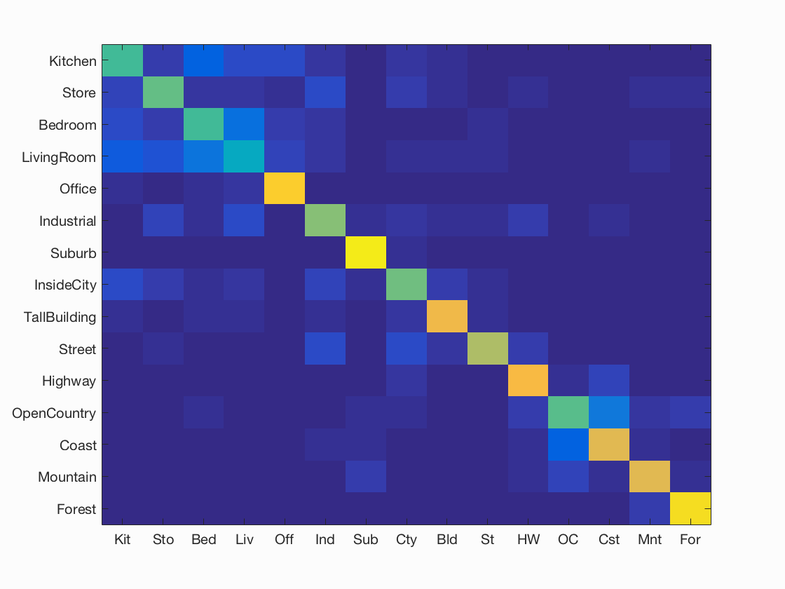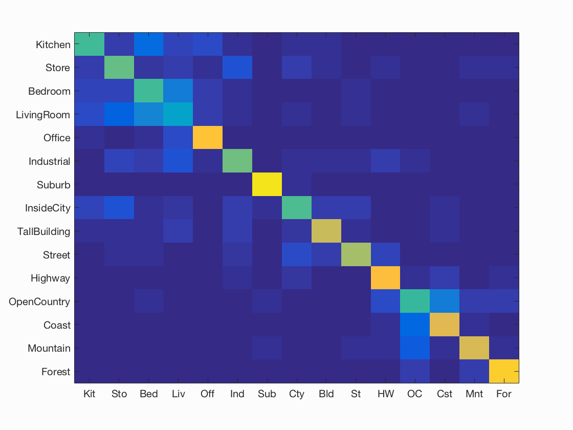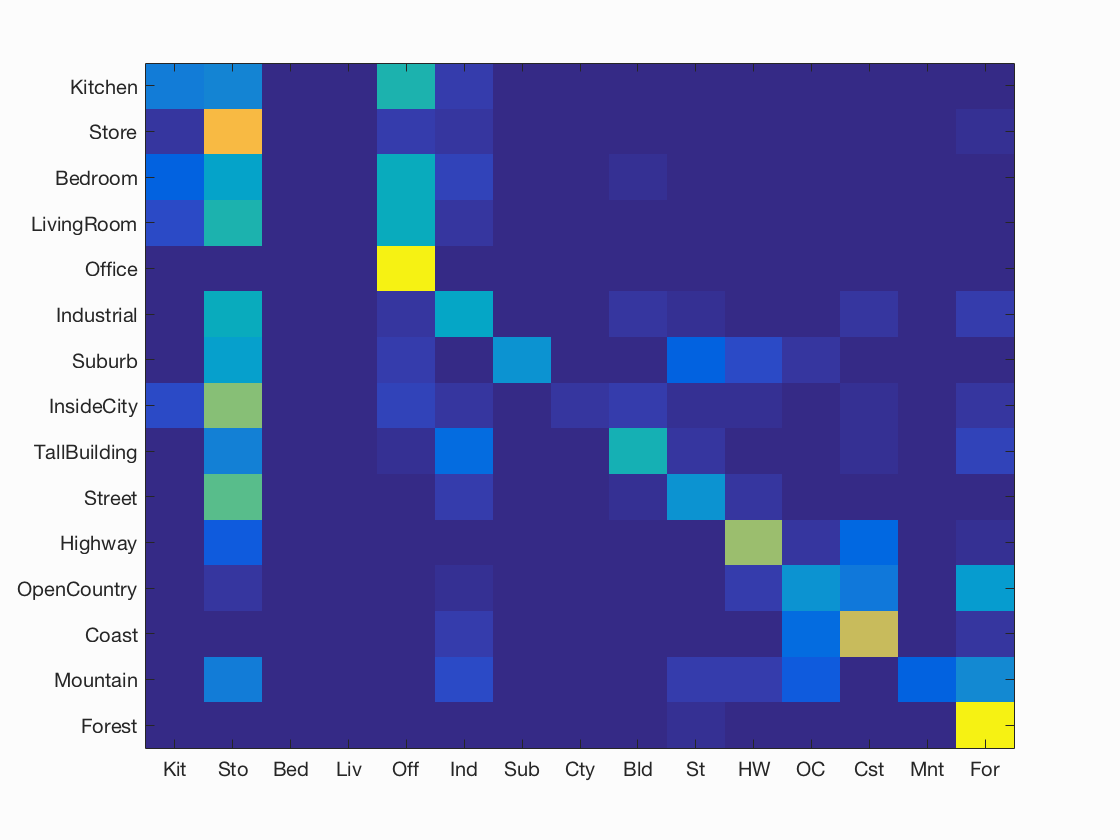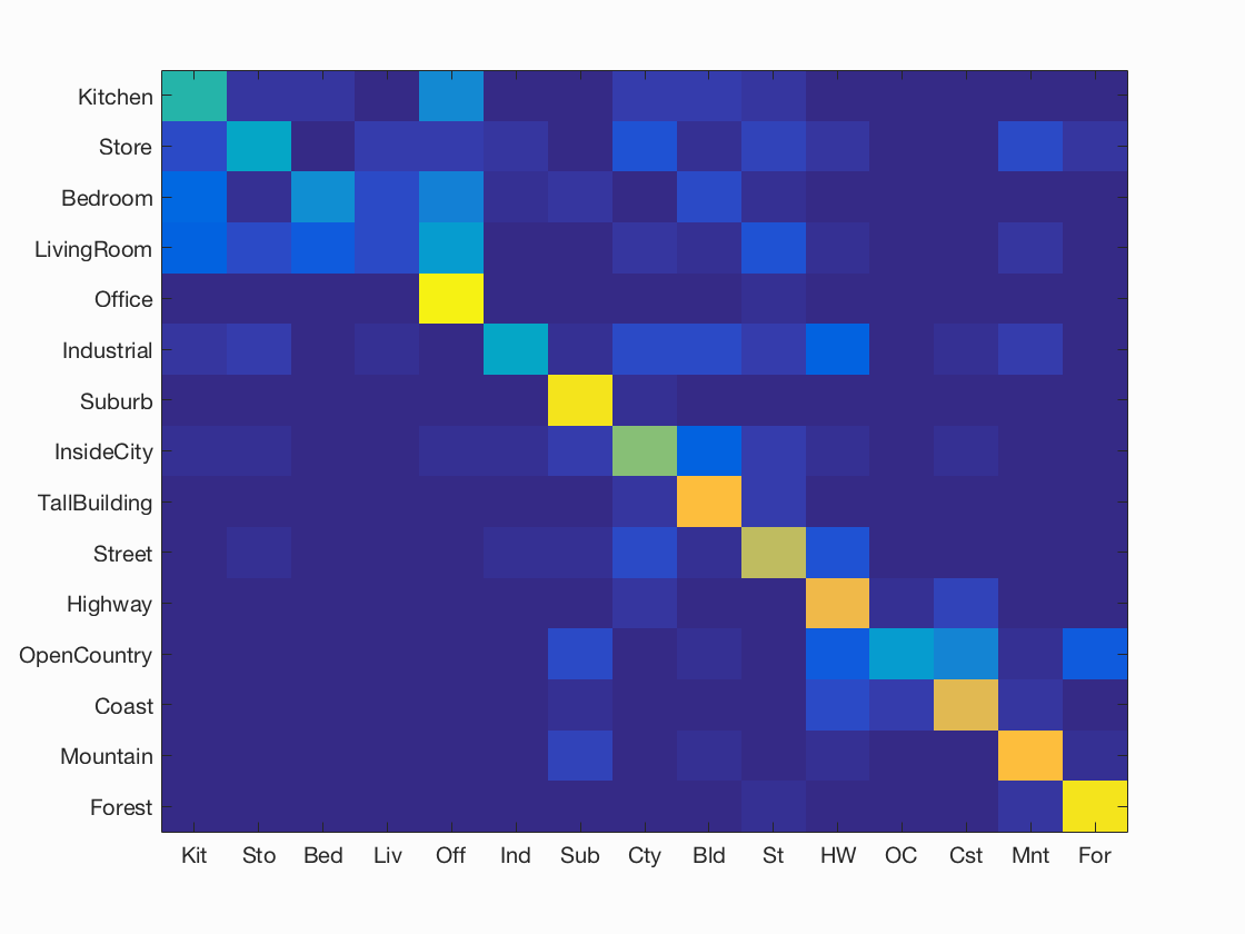 Results for bag of SIFT representation and linear SVM classifier with vocabulary size=1000, LAMBDA=0.0001