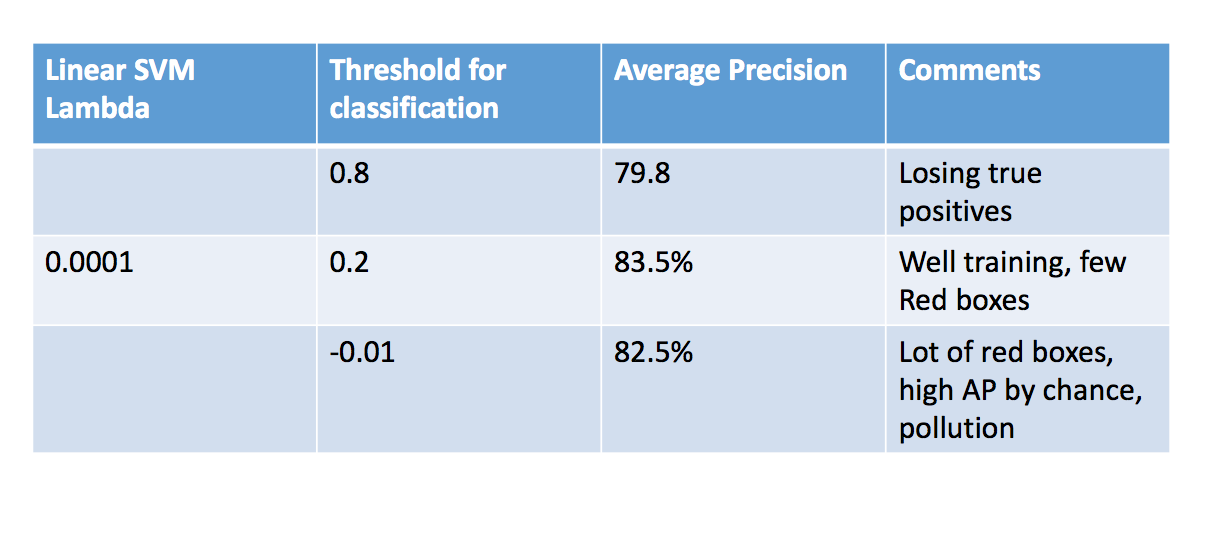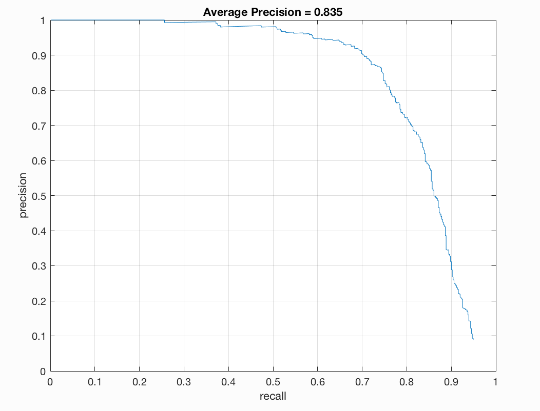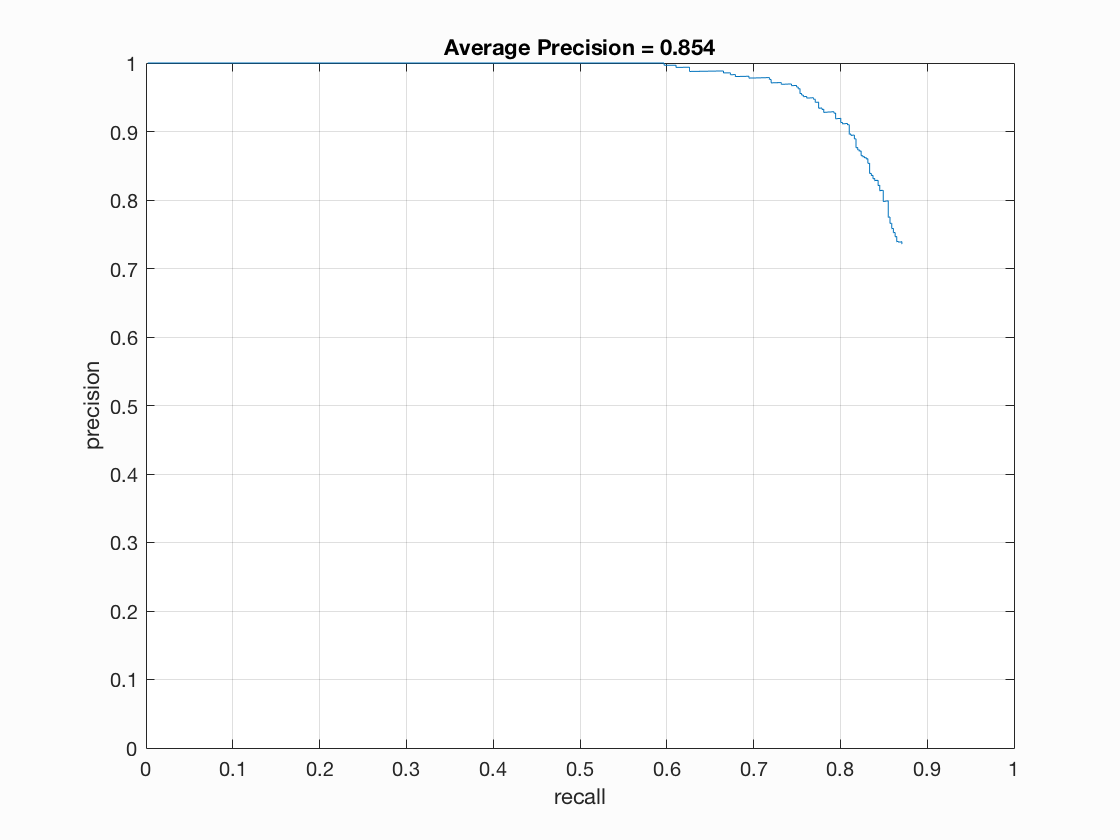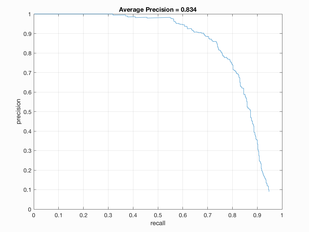 Thus, with a good classifier, we can obtain high precision and high recall for low values of threshold.The effect of NEgative hard mining does not slow down the execution too much. We can have a 6x6 cell size vl_hog in about 33s.