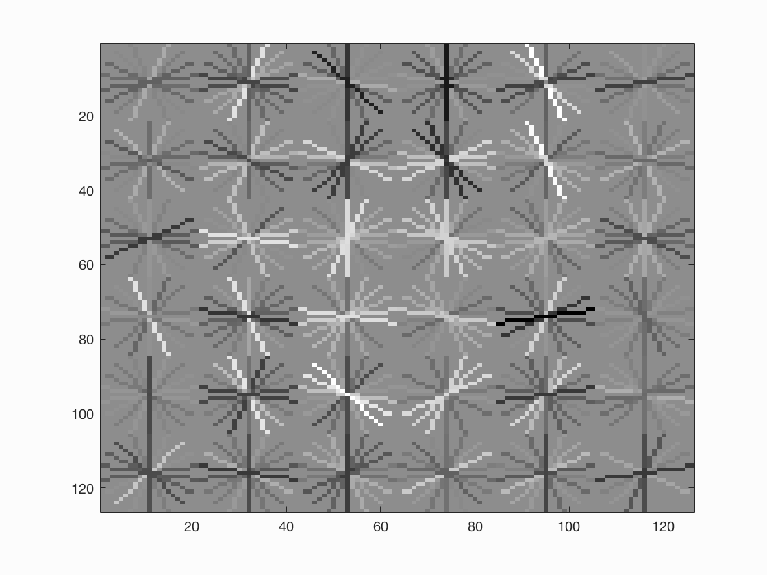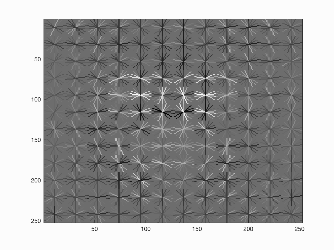 To account for face detection of multiple sizes, we train the faces at multiple scale. The scales used in this project are [1, 0.9, 0.7, 0.5, 0.3, 0.1]. Thus, when we have a test image with a larger than trained template (36x36 in our case) size face in it, it will be detected at a low scale on resizing it. HOG feature descriptor gives is the template histograms, which can be visualized as shown below.