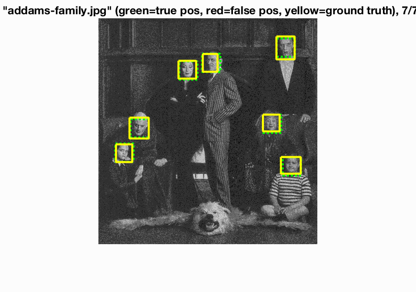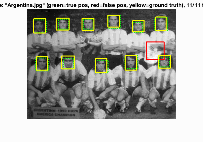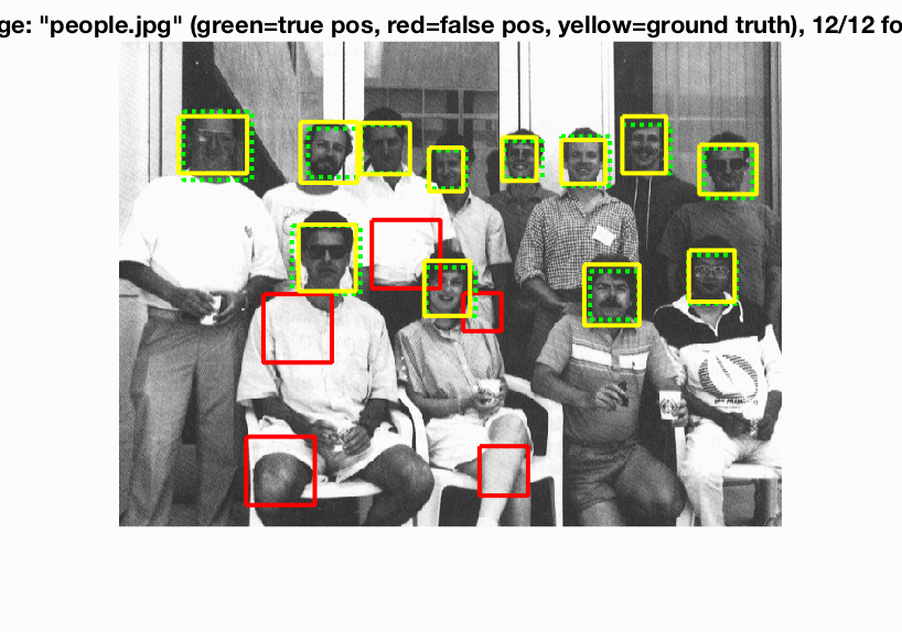 The base implementation is quite fast. One complete run can take anywhere from 25s to 2min depending on parameters like HOG cell size, threshold for SVM classification, etc. The training images is the Caltech face dataset, cropped to 36 x 36 sized faces. The non-face training images are random (36 x 36) sized crops of non-face scene images.