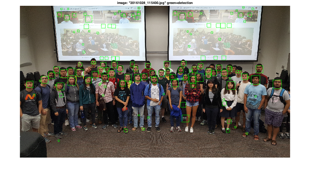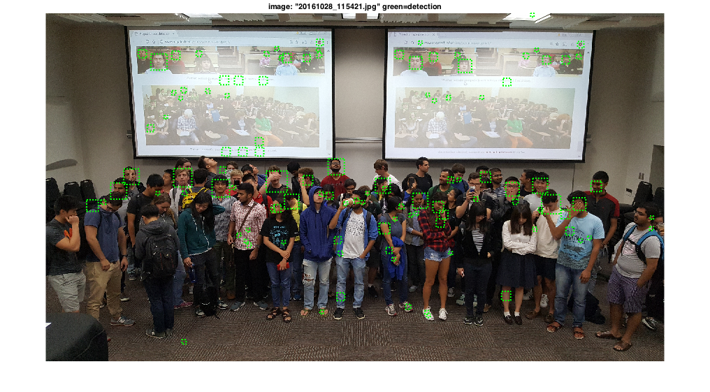 The average precision for the detection without hard negative mining was 81.1%. This value fluctuates somewhat depending on the randomness of the negative training samples. By running hard negative mining, the average precision increased to 84%. In both cases, all faces were detected in the sample image shown, but the hard negative mining produced fewer false positives. By limiting the number of high confidence false positives, the average precision can be improved. The images below show examples of face detections on two images of the class: