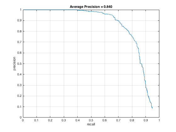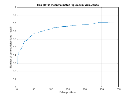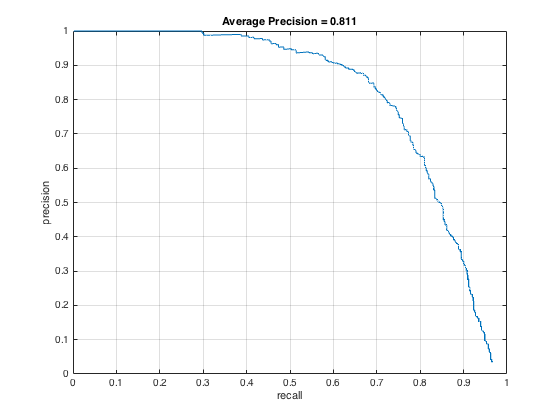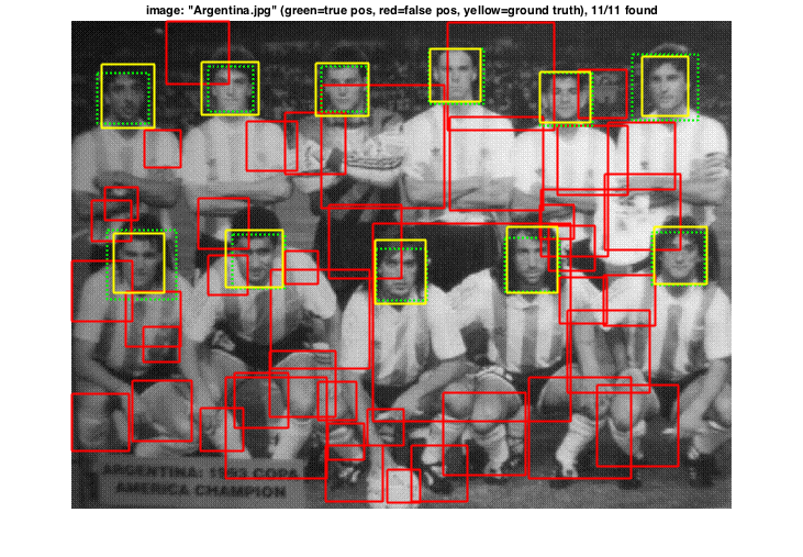 Each testing image is scaled at increments of 0.01 from 0.2 times the original size to 1.2 times the original size. These values were tuned manually to produce the highest precision. After the image is scaled, it is converted to HOG space using vl_hog(). A sliding window is then applied to the HOG representation of the image. This window is computed at increments of half the size of the HOG window. A smaller step size will tend to yield better precision, but will take longer to compute. Choosing half the window size appeared to be a good tradeoff in testing. Each window is then classified with the SVM. If the SVM output is greater than -1.5, it is labeled as a face. This threshold is quite low, so it will tend to produce a large number of false positives, but will avoid missing too many true positives. Finally, non-maximum suppression is used to prevent duplicate detections.