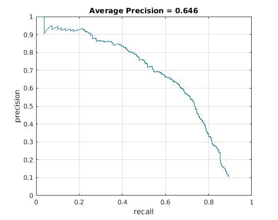 Utilizing these learned weights, the sliding window detector was run over the series of provided images. At this cell size, we achieved an average precision of 64.5%. The average precision and recall curve are displayed below, along with a sample image of detected faces.