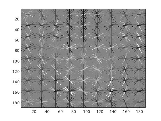 For this portion, we utilized a nerual network in MATLAB with a size-12 hidden layer. For a cell size of 4, the Neural Network weights and HoG visulization are displayed in the figure below.