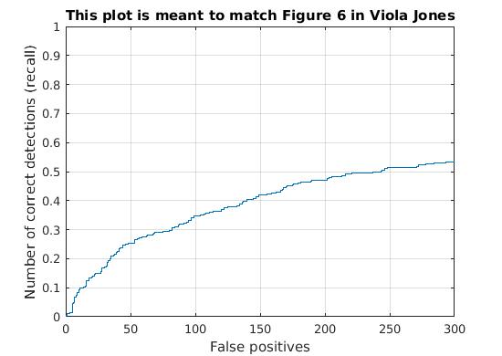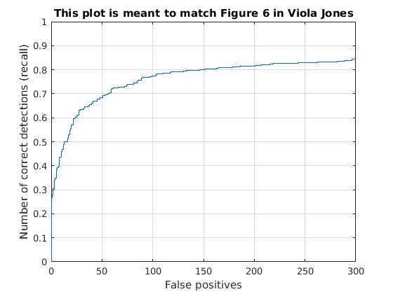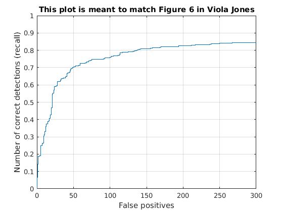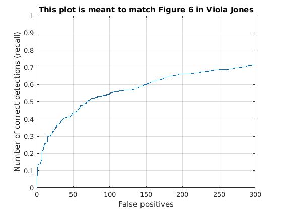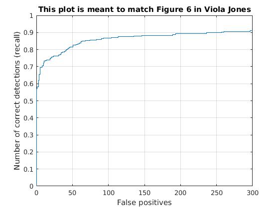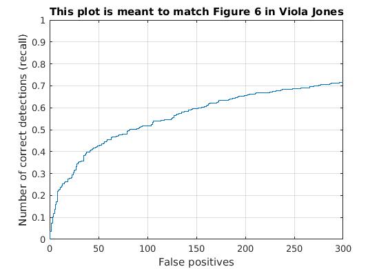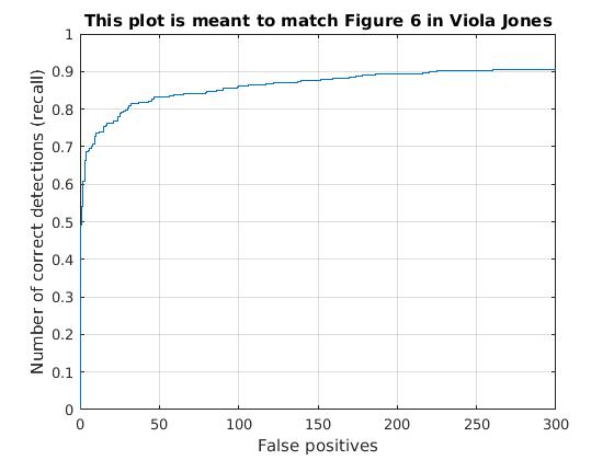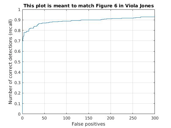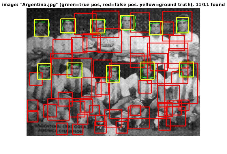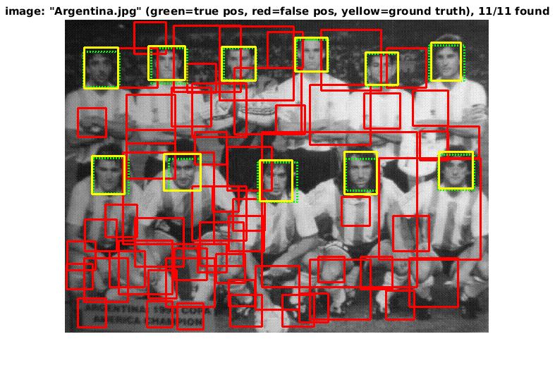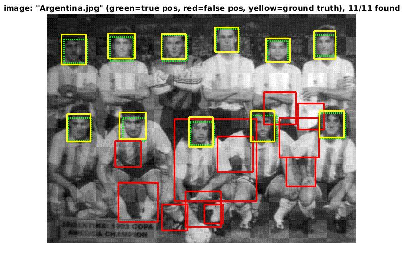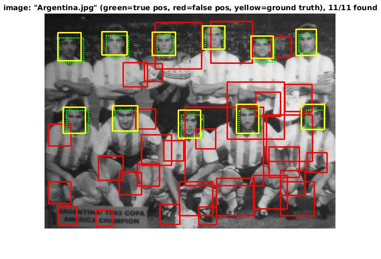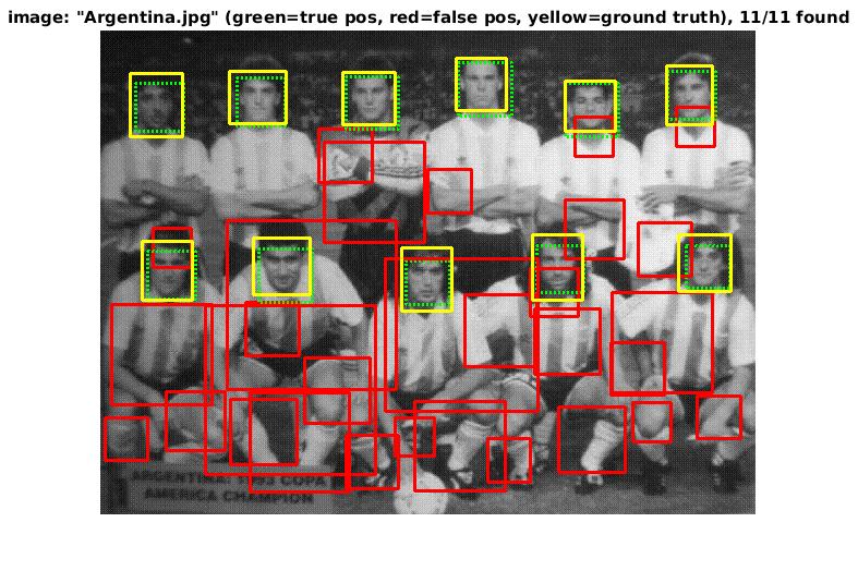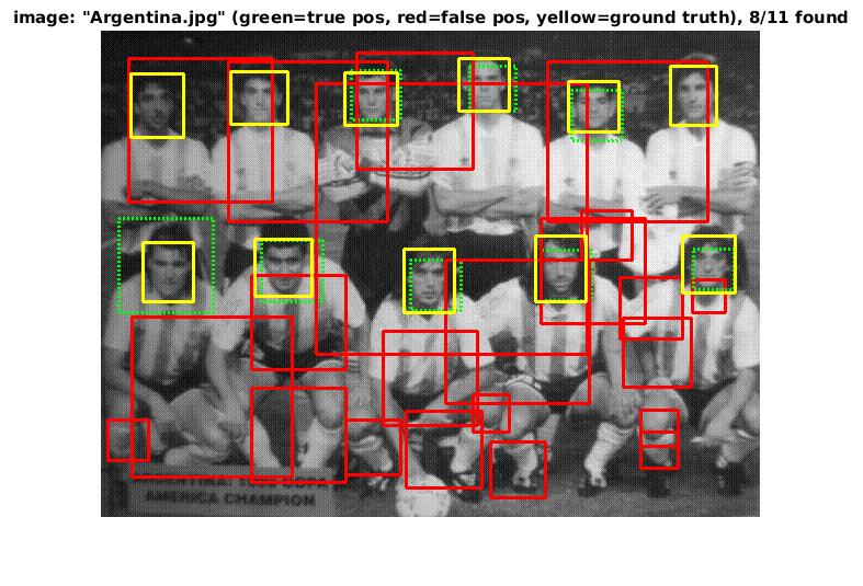 The above figure displays average precision/recall curve, recall/false positives, and a sample image of detected faces, respectively. The average precision only reaches 64.5%, in contrast to the provided vl_feat hog features. The sample image shows detected faces. Though all faces are found, a number of false positives are also reported. |