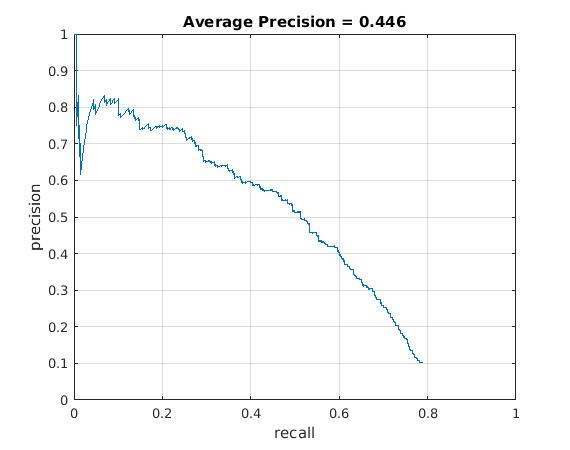 Utilizing these learned weights, the sliding window detector was run over the series of provided images. At this cell size, we achieved an average precision of 44.6%. The average precision and recall curve are displayed below, along with a sample image of detected faces.