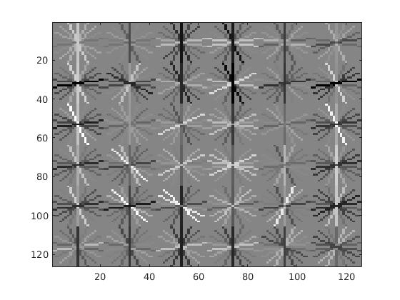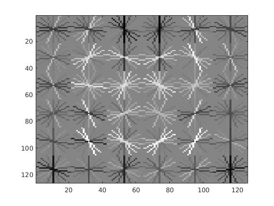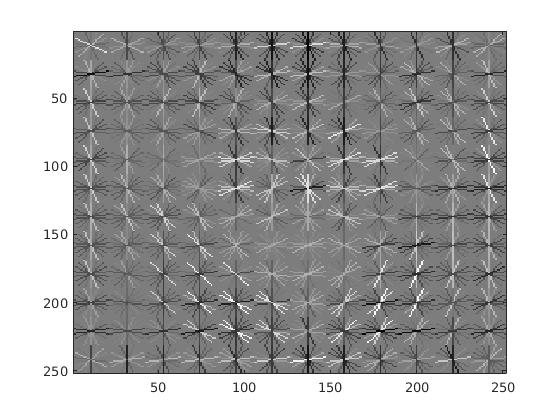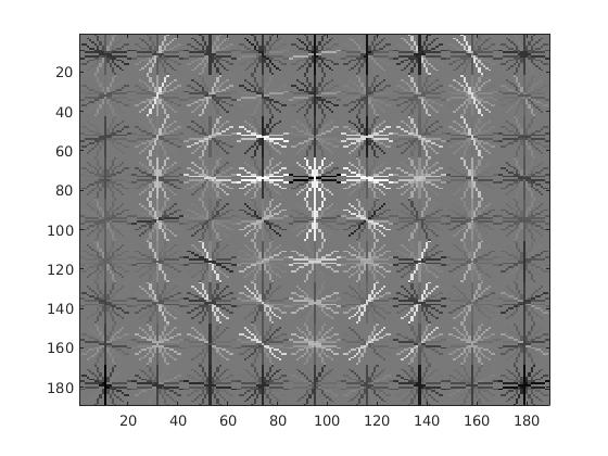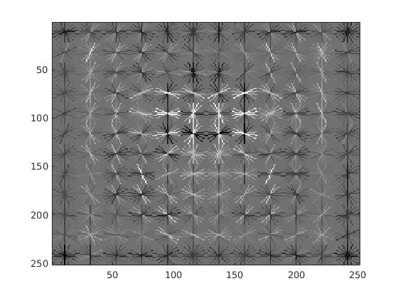 The figure below shows an example of a learned HoG descriptor face classifier. An interesting property of the classifier is that a face-like shape can be seen in the SVM weights, particularly if viewed from an angle.