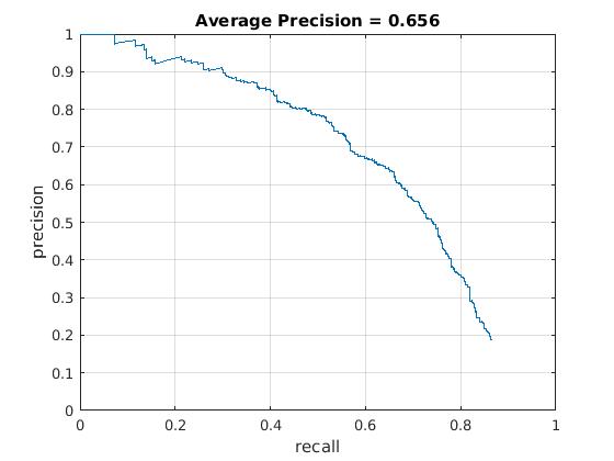 Utilizing these learned weights, the sliding window detector was run over the series of provided images. At this cell size, we achieved an average precision of 65.6%. The average precision and recall curve are displayed below, along with a sample image of detected faces.