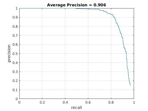 Utilizing these learned weights, the sliding window detector was run over the series of provided images. At this cell size, we achieved an average precision of 90.6%. The average precision and recall curve are displayed below, along with a sample image of detected faces. One thing to note about the nerual network classifier is that it was much slower than the SVM classifier, even though it achieved the same performance.