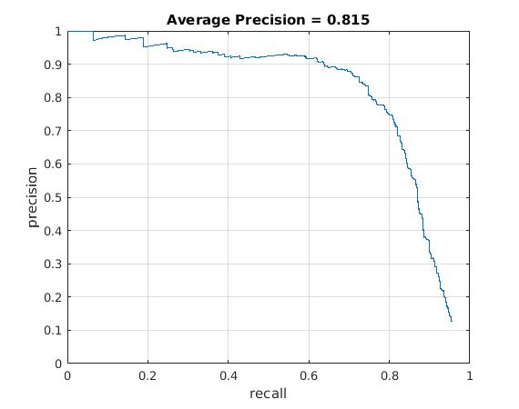 Utilizing these learned weights, the sliding window detector was run over the series of provided images. At this cell size, we achieved an average precision of 81.5%. The average precision and recall curve are displayed below, along with a sample image of detected faces. One thing to note about the nerual network classifier is that it was much slower than the SVM classifier, even though it achieved the same performance.