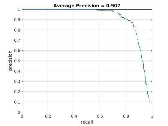 Utilizing these learned weights, the sliding window detector was run over the series of provided images. At this cell size, we achieved an average precision of 90.7%. The average precision and recall curve are displayed below, along with a sample image of detected faces.