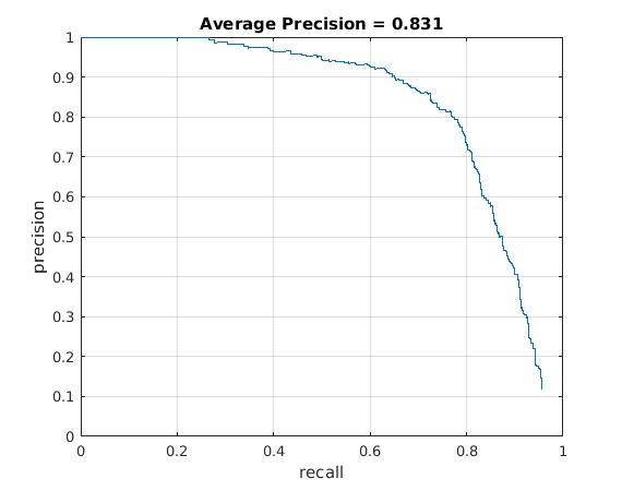 The above figure displays average precision/recall curve, recall/false positives, and a sample image of detected faces, respectively. The average precision meets the required 83%. The sample image shows detected faces. Though all faces are found, a number of false positives are also reported. |