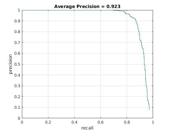 The above figure displays average precision/recall curve, recall/false positives, and a sample image of detected faces, respectively. The average precision meets the required 92%, exceeding it to 92.3%. The sample image shows detected faces. Though all faces are found, a number of false positives are also reported. |