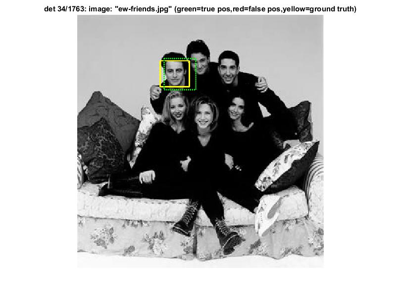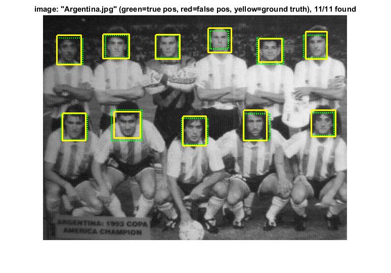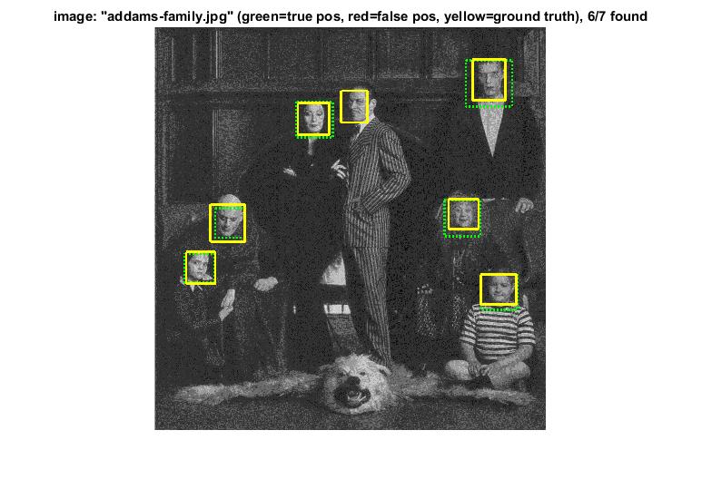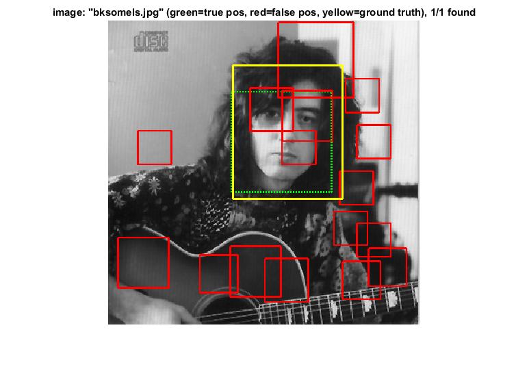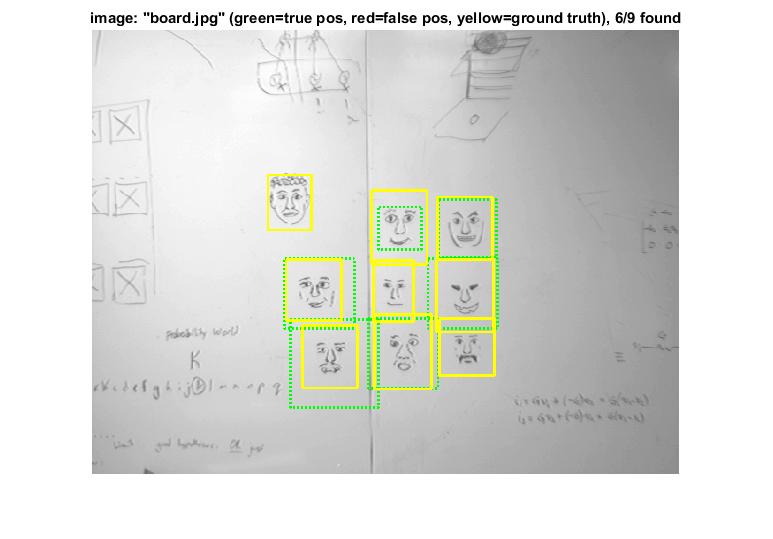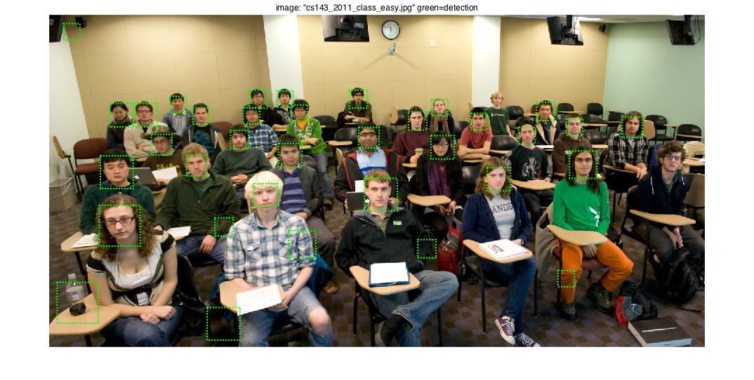 A sliding window is moved across the image to detect faces. The confidence of each window is calculated. Multi-scale sliding window is implemented, and non-maximal suppression is performed to find the most confident bounding box and to eliminate detection at multiple scales.