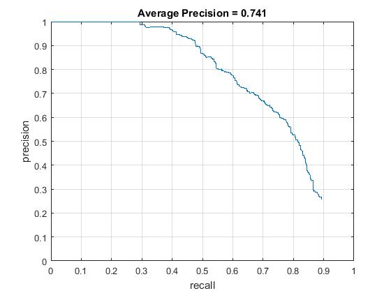 Without hard negative mining, the average precision was around 0.74. Only 10000 negative features were taken, to save on the computational time. The lambda for SVM training was set to 0.00005. With hard negative mining, the Average precision was approximately 0.812
