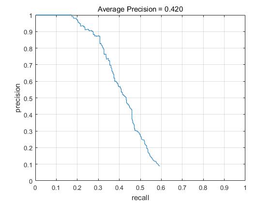 I set the the number of negative training samples as 10000, the lambda for linear SVM as 0.0001, HoG cell size as 6, and template size as 36. For the detector, I go through the entire HoG feature maps by step size 1 (namely 6 pixels since HoG cell size is 6) and the threshold for linear SVM is -0.2. I only use singel scale in the baseline. The baseline achieves the average precision of 0.42.