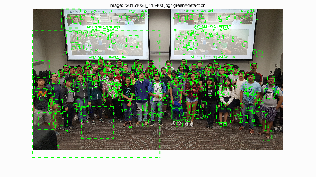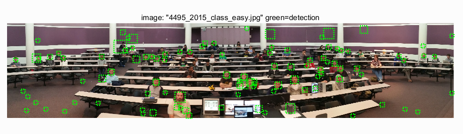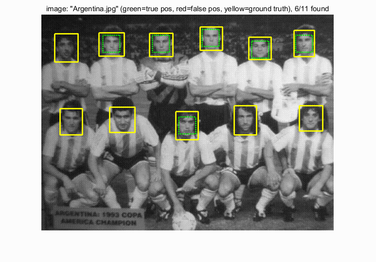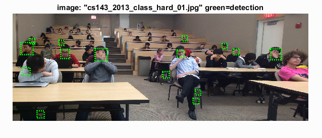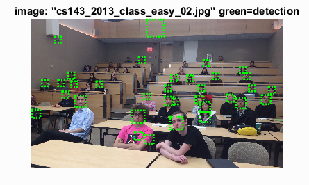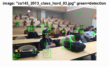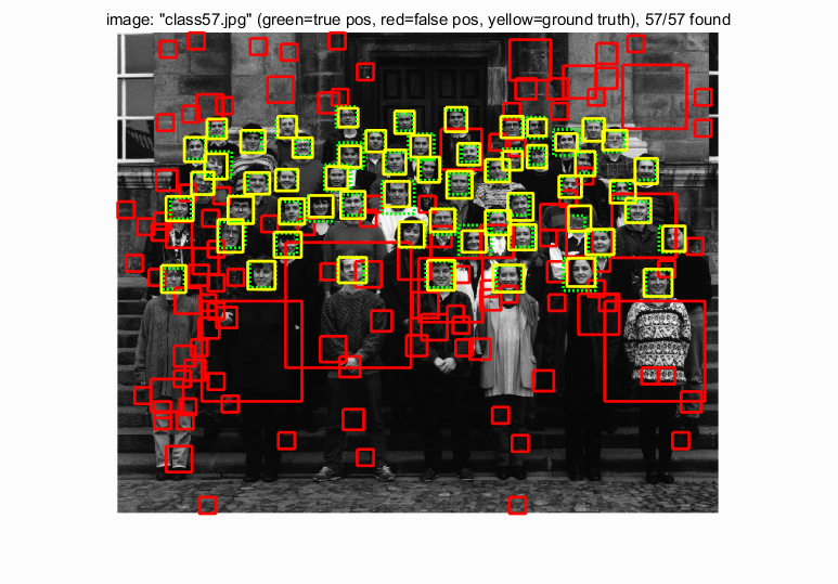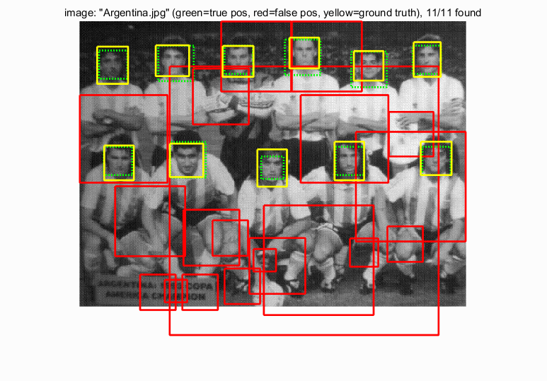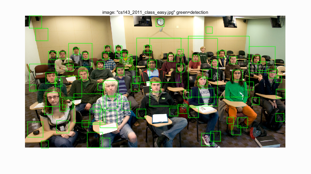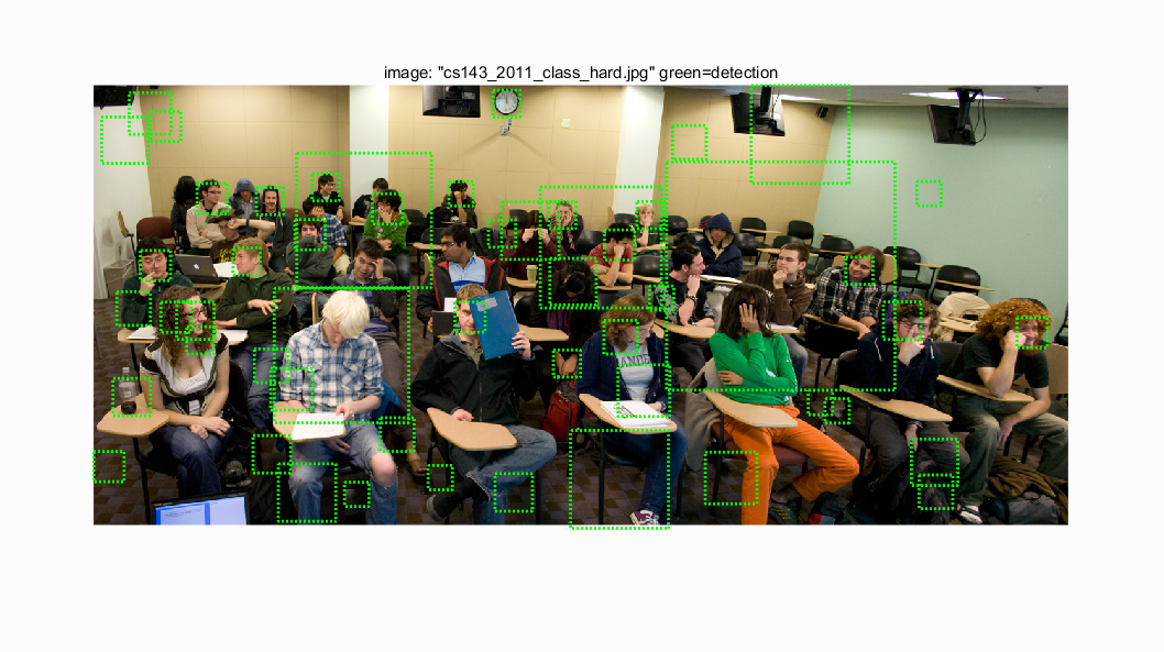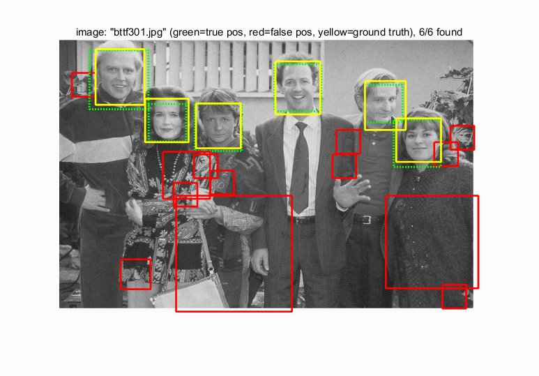 The followings are some results for detecting faces on extra scences with hard mining. Most faces are detected while a high persent of false positives exists: