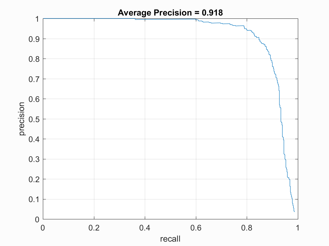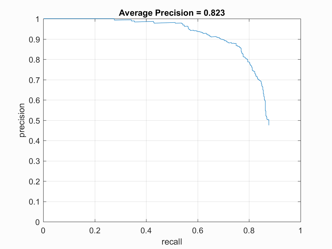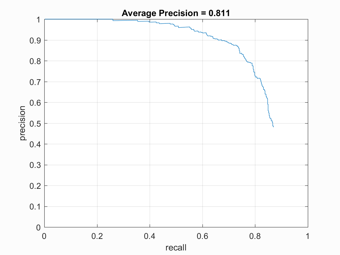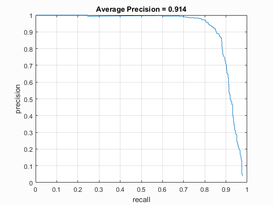 The table below shows the Accuracy-Recall curve with different setup and cell size. Note that by setting the threshold at low level, the system can obtain maximum recall, even if they return mostly false positives. As the results are ranked by confidence, the average precision can actually be boosted with a low threshold level. It is not practical for actual detection but can be used as a trick to achieve best Average Precision possible.
