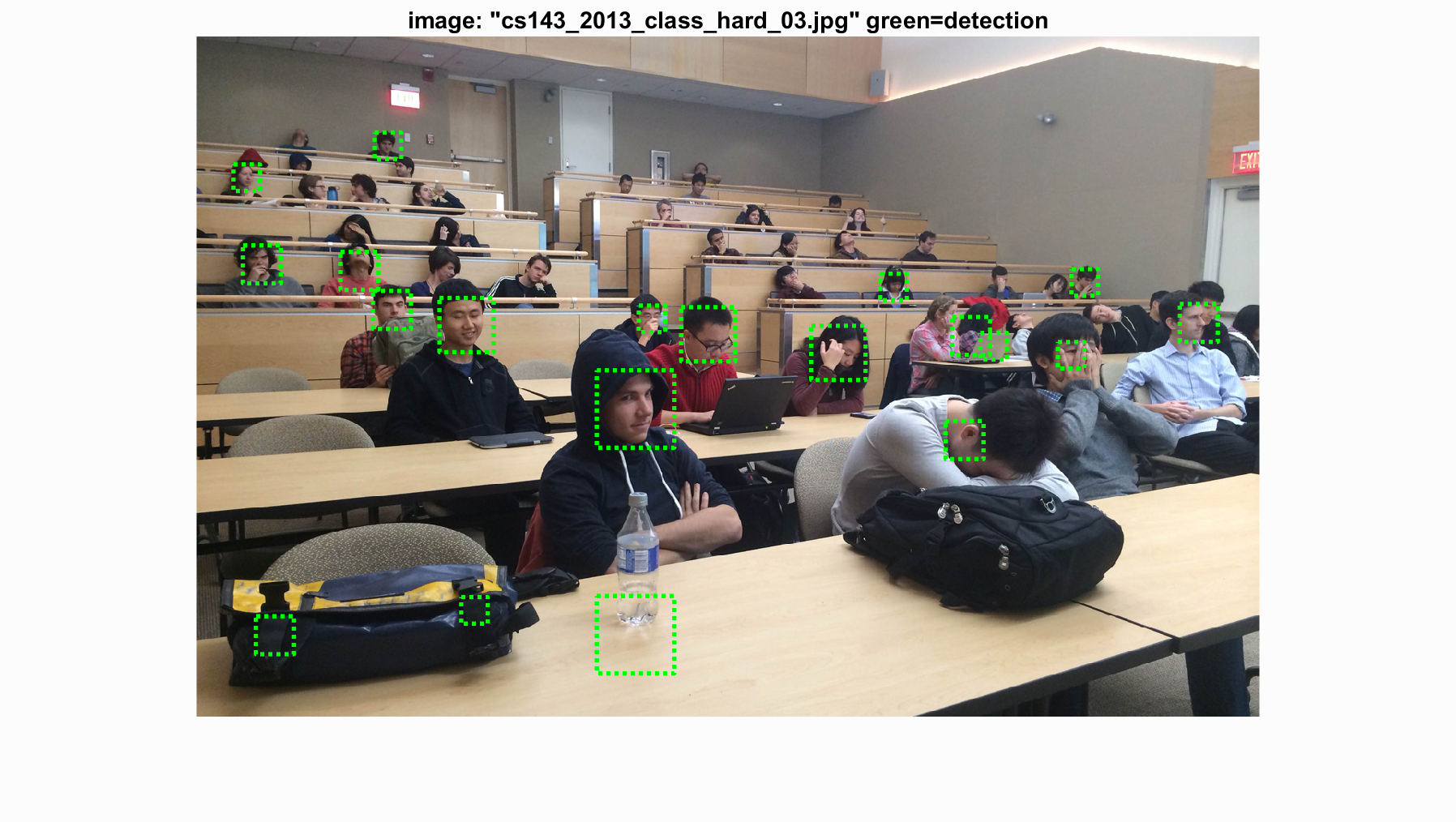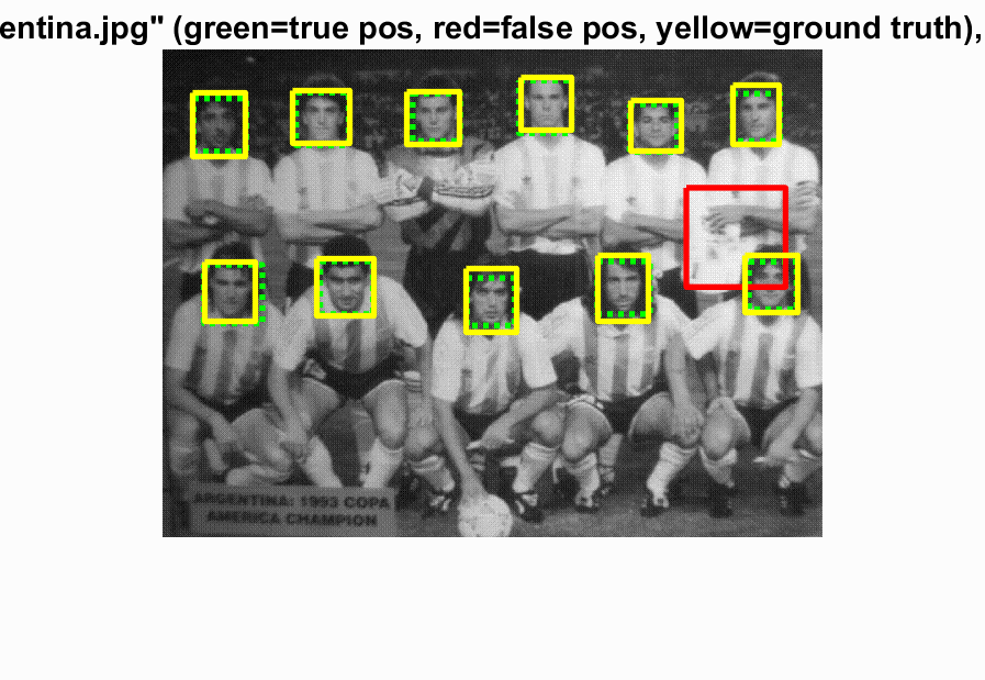 I have implemented hard negative mining in order to improve the quality of the training set. With the parameters obtained through the first run of svm training, classification results are obtained on each window for non-facial image. The window would be incorporated into the training set if the result reports positive based on a threshold. The threshold is set to 1.0 and the threshold on the actual detection is kept at 0.6.