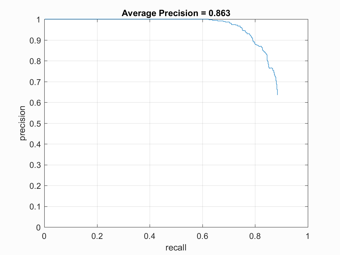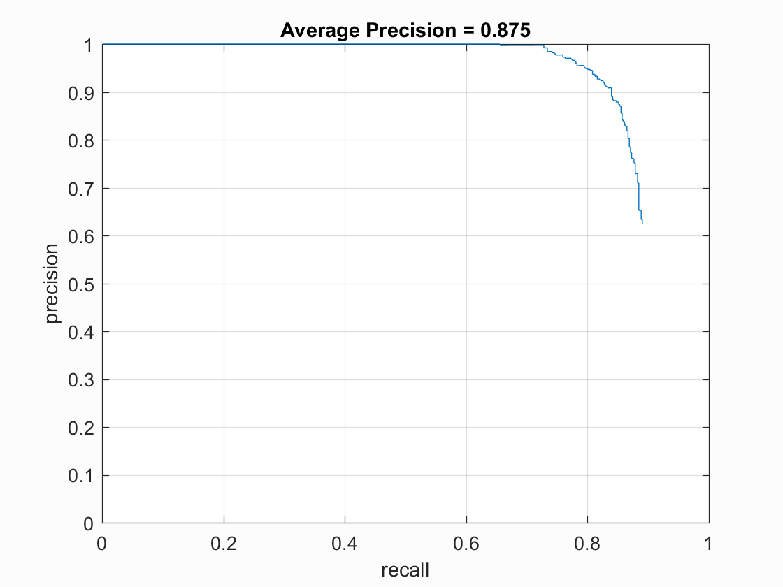 The image is scaled down by a factor of 0.9 in each iteration for a total of 20 iterations. Threshold is set at the level of 0.7 to eliminate negative results as well as positive results without enough confidence. In general, Average Precision increases as the cell size decreases.