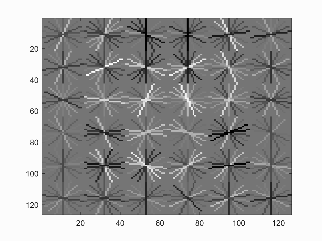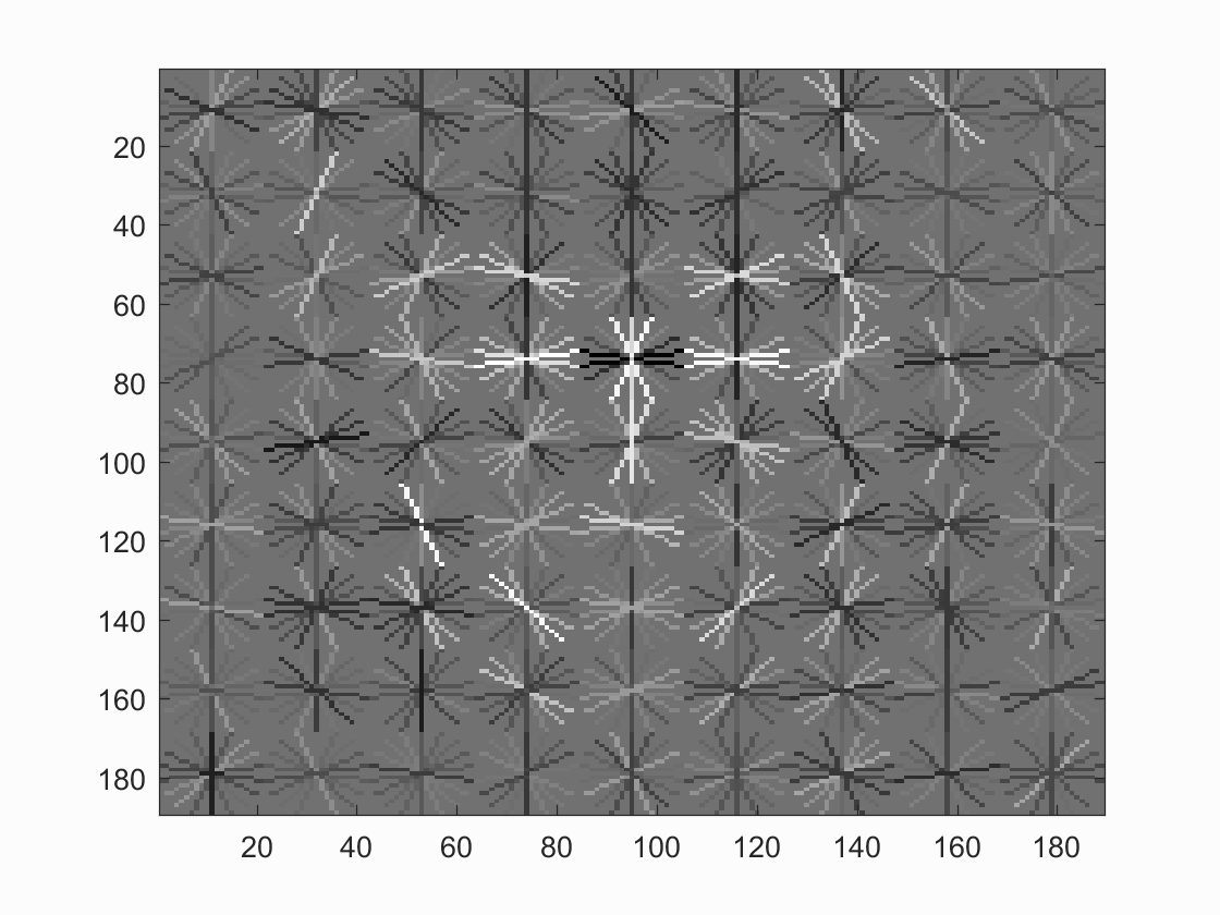 A number of facial and non-facial images are provided as the training set. Windows of defined size are obtained from the training set and used for training a linear svm classifier. With about 6000 positive windows and 10000 negative ones, the svm classifier can be easily trained within 30 seconds. The below figure shows the svm training result with different cell size. The hog features seem to make sense as they construct the human faces.