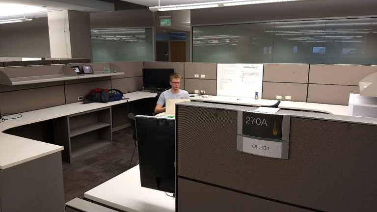 All office hours are held in the College of Computing Building room 270 (see picture below). This is in an open cubicle area in the center of the floor. Just look for the 1331 one. The TA(s) on duty will be there at the times listed in the table below. Scroll down below the table to see pictures of the TAs and their recitations. You do not need to get help from your specific section TA. Any TA can help you during office hours, unless you have a specific question regarding previous HW grades.