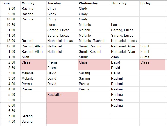 All office hours are held remotely/virtually via ... The TA(s) will have specific times in which they will be available as listed in the table below. Scroll down below the table to see pictures of the TAs and their recitations. You do not need to get help from your specific recitation section TA. Any TA can help you during office hours, unless you have a specific question regarding previous HW grades.