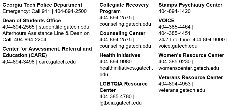 If you are a student with learning needs that require special accommodation, contact the Office of Disability Services at 404.894.2563 or http://disabilityservices.gatech.edu/, as soon as possible, to make an appointment to discuss your special needs and to obtain an accommodations letter. Please also e-mail me as soon as possible in order to set up a time to discuss your learning needs.