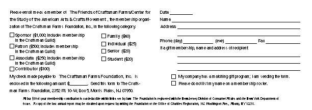 . . . being a member of the Craftsman Farms Foundation. As a member you'll receive our attractive and newsworthy newsletter, "Notes from the Farms," announcements about all Farms activities, invitations to our events, free admission to tours of the Main House and a 10% discount in the bookstore.