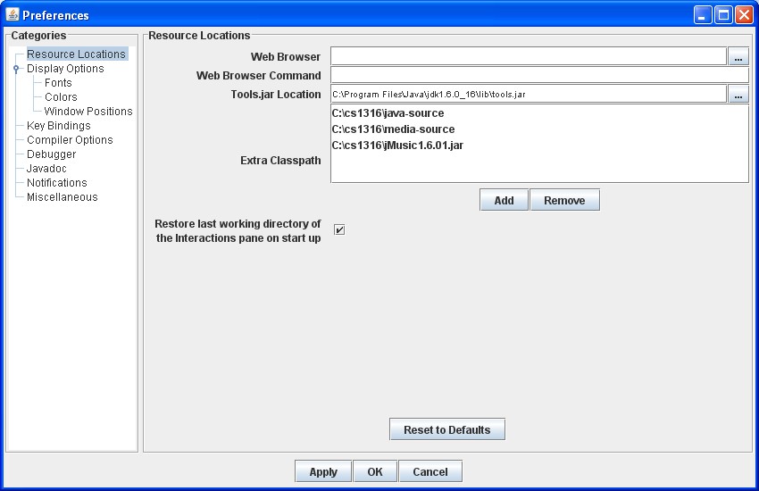 | 2. Dr. Java will either find the tools.jar for you or ask you to locate the tools.jar for it. If you selected default locations in Windows to install Java, the tools.jar should located at C:\Program Files\Java\jdk1.6.0_16\lib\tools.jar. |