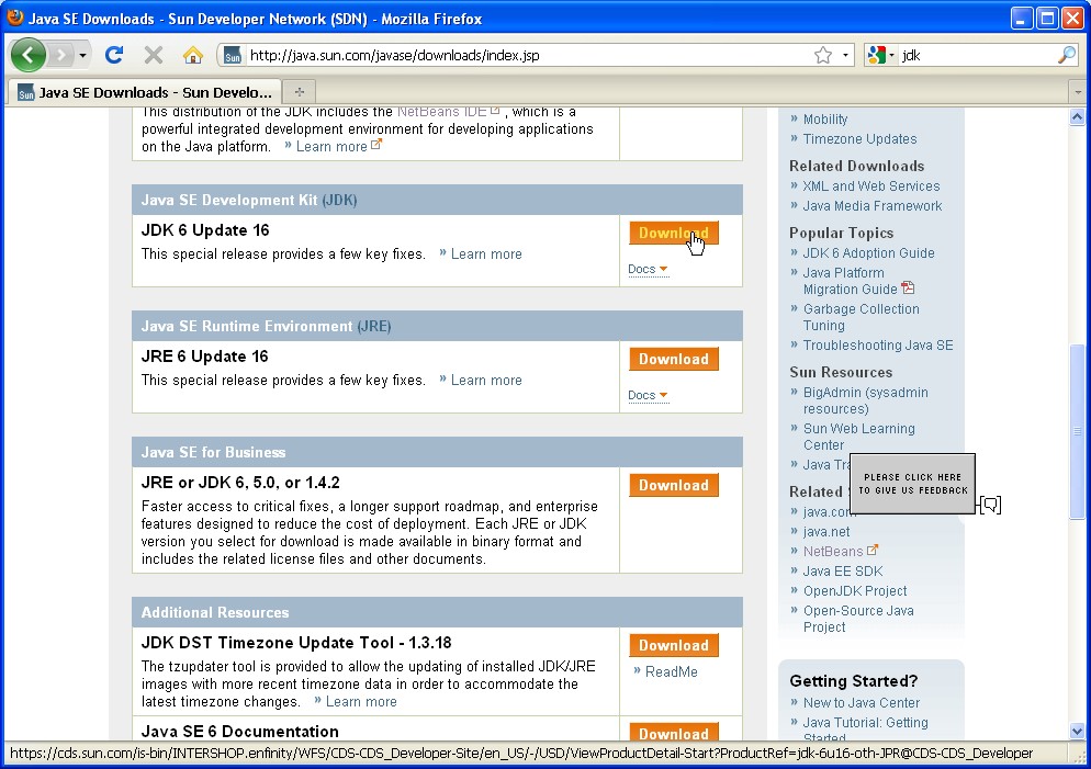 | 3. Download the Java JDK if you do not already have it by going to http://java.sun.com/javase/downloads/index.jsp and clicking on the download button in JDK 6 Update 16 section. |