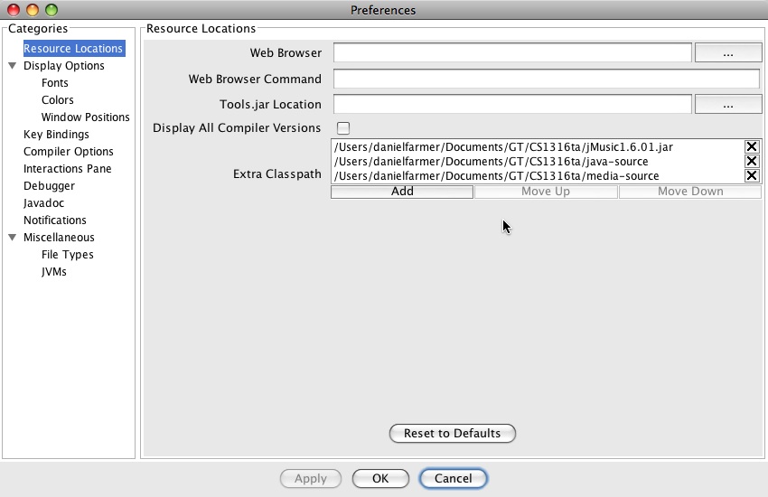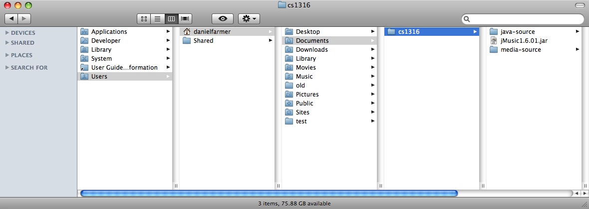 | 1. Copy jMusic1.6.01.jar from this webpage, MediaSources.zip and java-sources.zip to a folder on your hard drive. We recommend putting everything in /users/username/Documents/cs1316. |