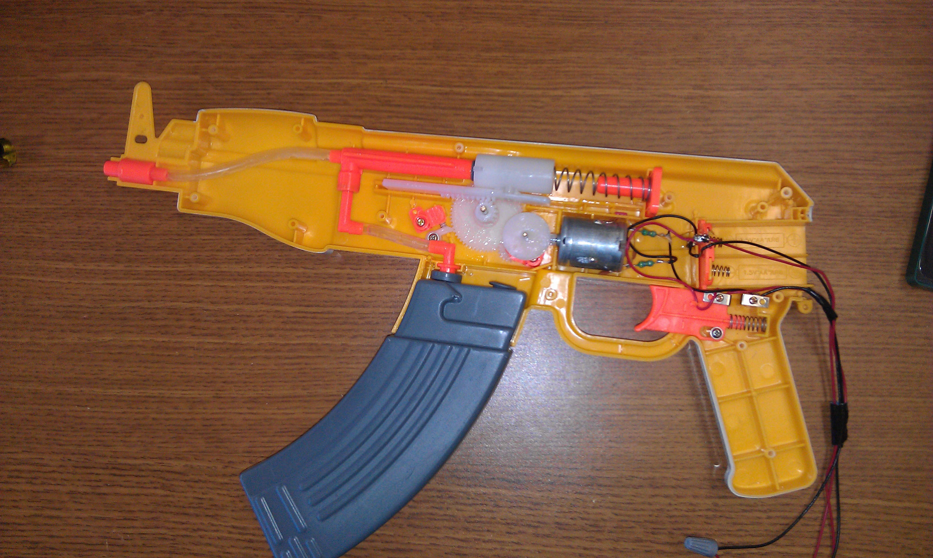 Prepare the waterguns for use in the device by soldering on wires that can activate the firing switch, and wires to replace the battery as a power source.