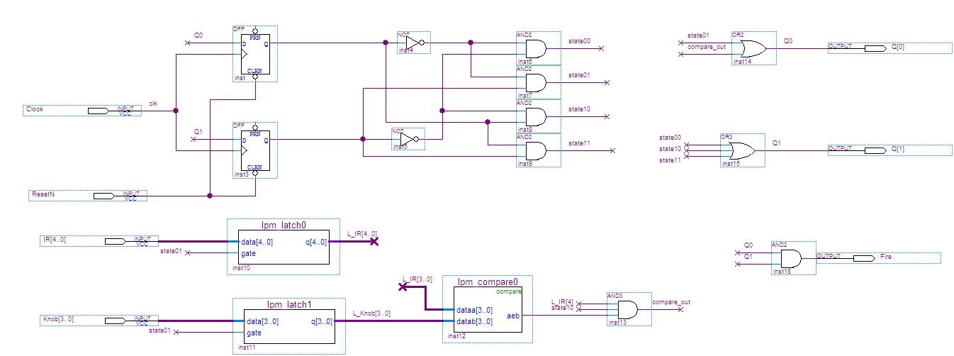 Next we will construct the state machine that drives the logic of the device. Click here for the full schematic. The final result will look something like this.