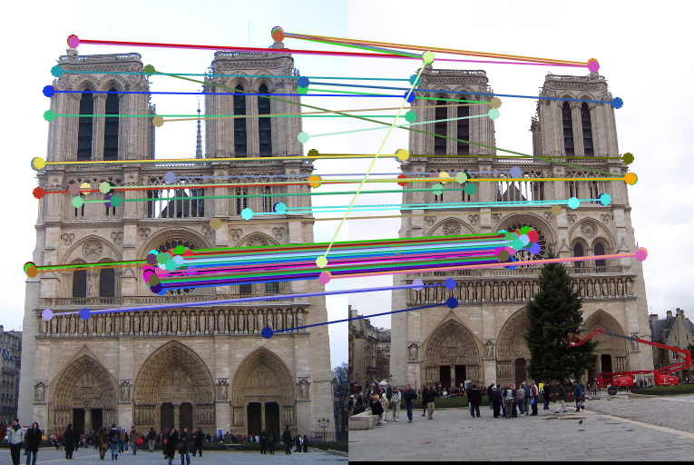 Details of above steps are described in the following with explanatory figures and test results. The overall accuracy of the proposed feature matching algorithm is 139/149 (93.29%) for 'Notre Dame' image pairs.