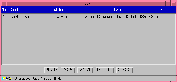 The idea behind this project is to build a mail reader that will function independently of the platform it is being used on. Ideally, the only thing that the user will need to run this mail reader is a browser capable of using Java applets. The user should be able to go to any computer available to him and, given a Java capable browser, read his mail.